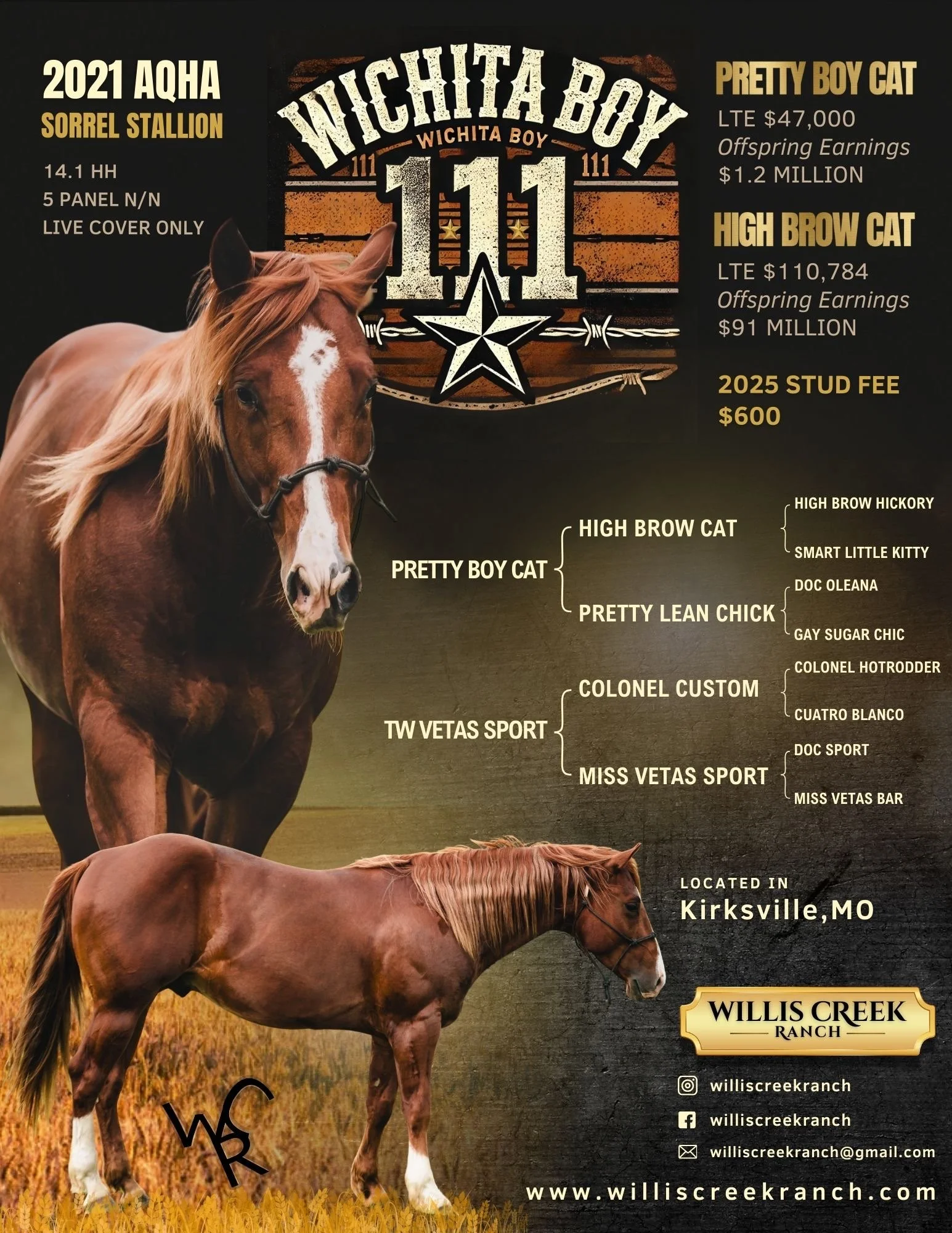 We provide quality breeding with our stallion, Wichita Boy 111, known for his exceptional confirmation, athletic ability, and calm disposition. Our commitment ensures each offspring inherits these exceptional traits, making him ideal for enhancing breeding programs.